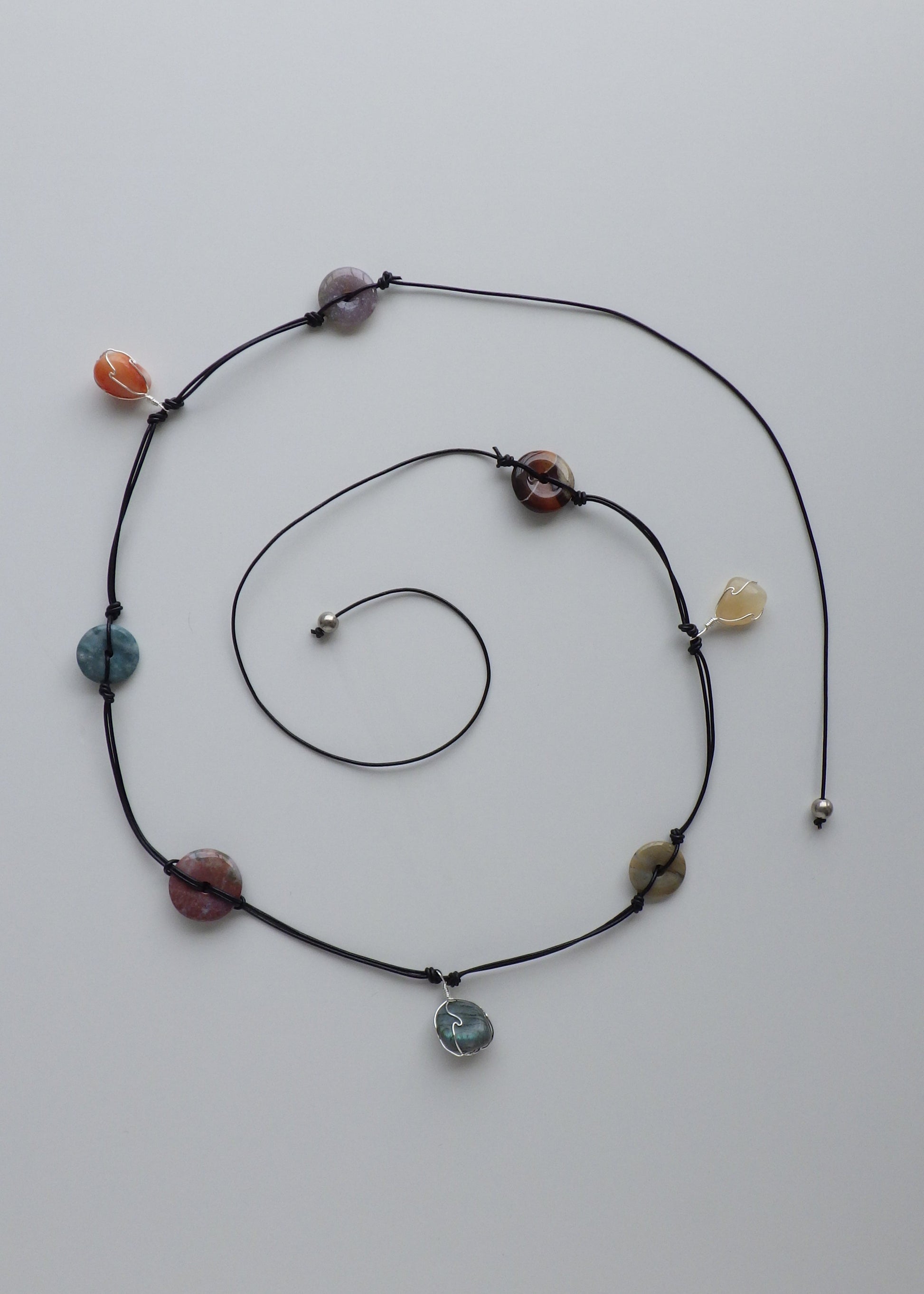 Description - Agate donuts, moonstone, Labradorite and carnelian pendants - premium leather - stainless steel bead ends